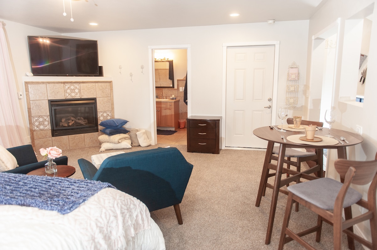Hundvänligt! Ombyggt pensionat i pittoreskt, mycket lugnt och vänligt grannskap. Egen ingång och parkeringsplats. Fristående från huvudhuset med en privat inhägnad gård. Inom stadens gränser, men med en känsla av att vara utanför staden. (Inga stadsbelysning! Stjärnorna är otroliga!) bara några kilometer från sjöarna, med den extra fördelen att vara bara en kort bilresa till restauranger, shopping, barer och allt Flagstaff har att erbjuda. Vandrings-/cykelleder bara några steg bort!
