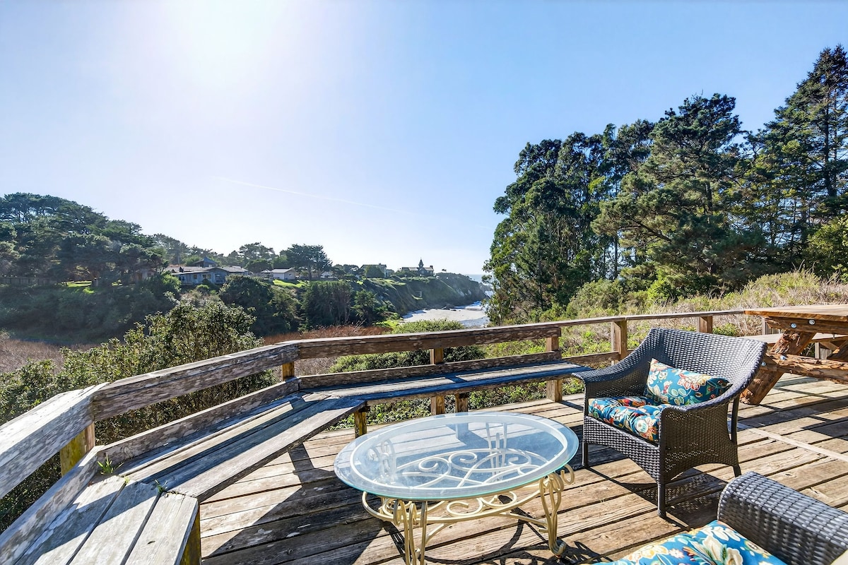 Vakna till havsvågor i denna Mid-Century ranch pärla-4BR/2.5BA, 2 000 kvadratfot sover 12 på 1+ Acre, Steg från Hare Creek Beach. Retro charm lyser med flagstone öppen spis för familjens berättelsetid. Öppet kök flödar till ett däck med våt bar och eldstad mitt i höga cypresser – perfekt för avkoppling med hela gänget. Bara 300 meter till strandstigen; 5 minuter till Glass Beach och centrala Fort Bragg. 10 minuter till Mendocino. Husdjursvänligt – ta med Fido för kustromps! Koppla av i Mendocinos magi!
