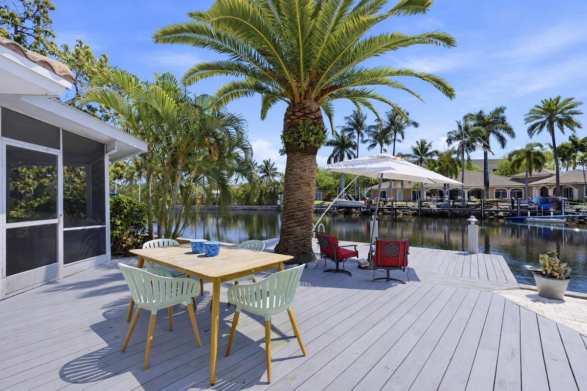 🌴Välkommen till din tillflyktsort vid kanalen! Ha lite kul i poolen med familjen, eller njut av några drinkar i bubbelpoolen och bygg in en ny våt bar. 🍹Vår uteplats har en TV 📺— perfekt för att titta på ditt favoritlag spela eller för familjefilmkväll. 🍔🔥Koppla av under paviljongen med grillplats, 💪🏋️♀️eller träna i utomhusgymmet. 🛌Bekväma sovrum och två renoverade badrum garanterar en bra vistelse. Bara några minuter från Pompano Beachs vackra stränder och restauranger! 🏖️