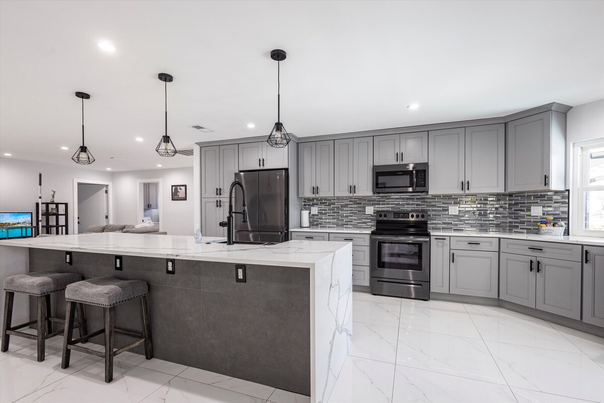 Welcome to Caribbean Gem! This modern 3BR/2BA retreat features a private pool and hot tub perfect for relaxing. We are dog-friendly, offering a fully fenced side yard with easy-clean artificial turf for your pups. Enjoy a screened-in patio, fast WiFi, and a fully stocked kitchen. Located just 15m from downtown Ft. Myers and 30m from Sanibel and Ft. Myers Beach. Experience sleek comfort and fresh eggs from our roosters! Note: Pool is not heated; hot tub is separate.