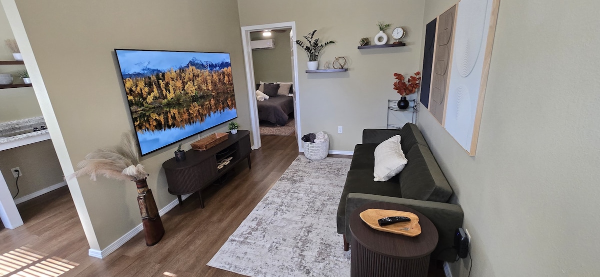 Njut av denna unika vistelse genom att sova i ett mysigt loft. Snabbt Internet 100 Mbps. Klättra uppför biblioteksstegen för att sova i en King size-madrass på loftet med utsikt över bostadsutrymmena. Boende inkluderar bäddsoffa som kan sova två, bord, kylskåp, mikrovågsugn, kaffebryggare. Vackra träytor och anständig storlek badrum. Centralt beläget på Rogers Ave nära centrum. Sviten har sin egen parkeringsbetongplatta. Gästsviten ligger vid vårt hus, staketet skiljer oss åt. Husdjur MÅSTE läggas till i gästlistan