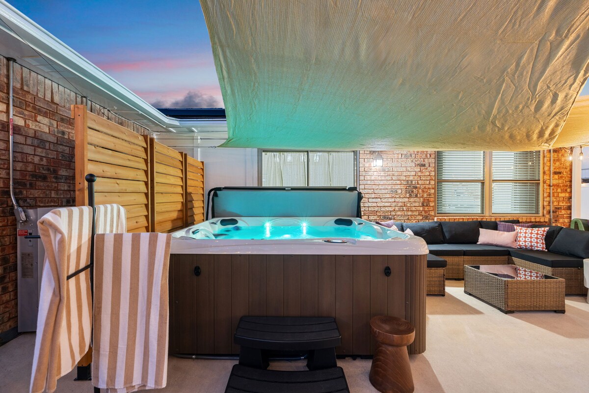 Lyxig bubbelpool i resortstil, teater och spelrum