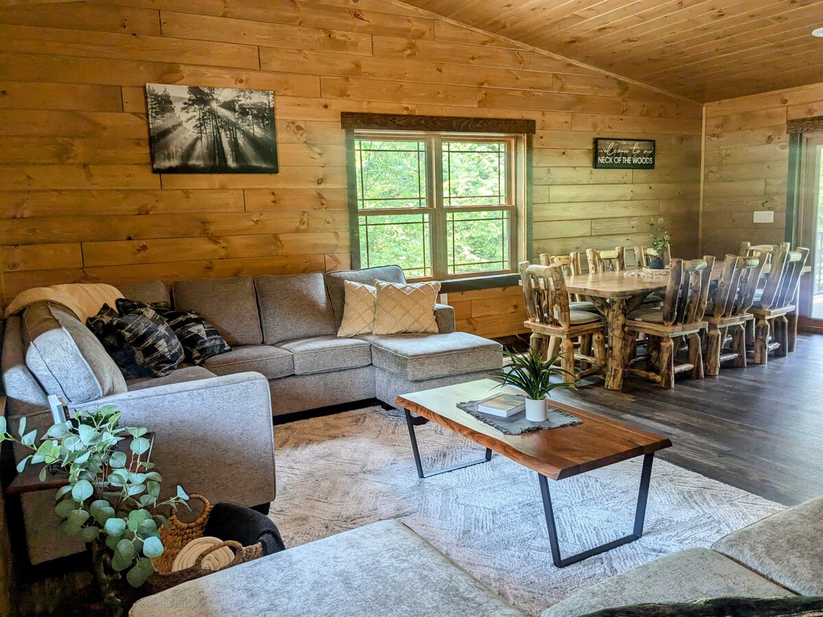Quiet wooded setting for authentic log cabin: *Self-contained wooded area. Owners live nearby. Other homes visible in winter. *1/2 mile country dirt road passes homes on way to cabin. Please drive slowly! *Signs along road after GPS leaves off. *Parking area turn around. *Complete bathroom *Kitchen: convection oven/ air-fryer/ microwave combo, Keurig, toaster, under counter frig. / small freezer. *Loft queen bed *Double Futon *Pots, pans, utensils *Table service for 4 *Games, books