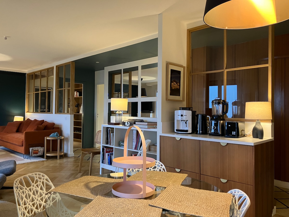 75 m² loft på 11:e våningen med panoramautsikt över Rhône, Fourvière och Lyons hustak, på dagen och på natten. Genomtänkt designad av en inredningsarkitekt: original konstverk, kvalitets sängkläder, fullt utrustat kök. Perfekt för par, familjer med små barn (fullständigt babykit ingår) eller yrkesverksamma på längre vistelser.