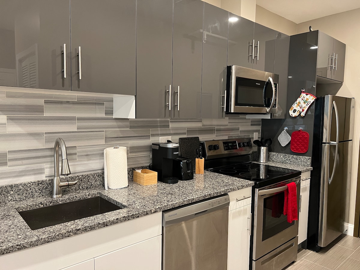 Njut av denna helt nya lägenhet med 3 sovrum och 2 badrum med modern design och exklusiva ytbehandlingar överallt. Det fullt utrustade köket erbjuder vitvaror i rostfritt stål och en diskmaskin, perfekt för enkla hemlagade måltider. Rymliga sovrum och eleganta badrum ger komfort och avskildhet, medan privat parkering för en bil och en tvättmaskin och torktumlare i lägenheten ger vardagsbekvämlighet. Perfekt för familjer, grupper eller affärsresenärer som vistas kortare eller längre.