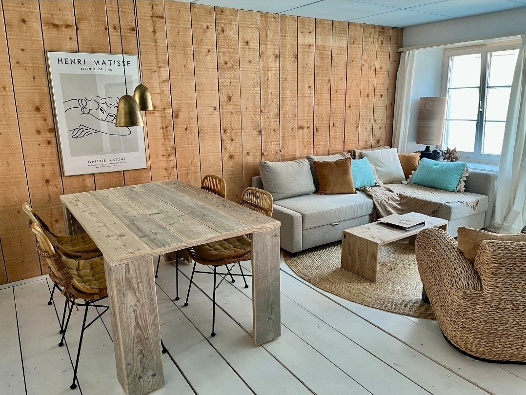 Välkommen till vår lägenhet i strandstil. Denna nyrenoverade lägenhet i strandstil designades av den välkända konstnären Cat Bakker med mycket kärlek till detaljer och utstrålar en avslappnad, kreativ atmosfär som bjuder in dig att dröja dig kvar och koppla av. Kombinationen av konst och de hållbara och handgjorda möblerna av Herbert Näf ger lägenheten en distinkt, varm atmosfär. Trädgården och galleriet på bottenvåningen är unika.