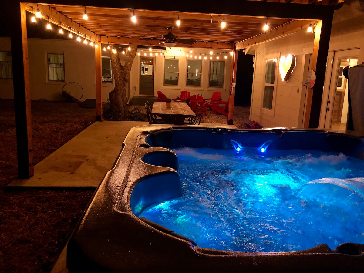 Vår bekväma lilla stuga ligger bara ett kvarter från butiker och restauranger på huvudgatan; det är det PERFEKTA stället för en parhelg, tjejutflykt eller kul med vänner! Två sovrum/två badrum med ett fullt utrustat kök och underbara uteplatser med PRIVAT BUBBELPOOL för en avkopplande kväll bland stjärnorna. WiFi, kaffe och te tillgängligt. Vi har annonserat ut detta boende i 7+ år på andra webbplatser, men vi är så glada över att vara på AirBnB! Vi kan knappt vänta på att få träffa dig! Tillstånd #FBGTX - 17250
