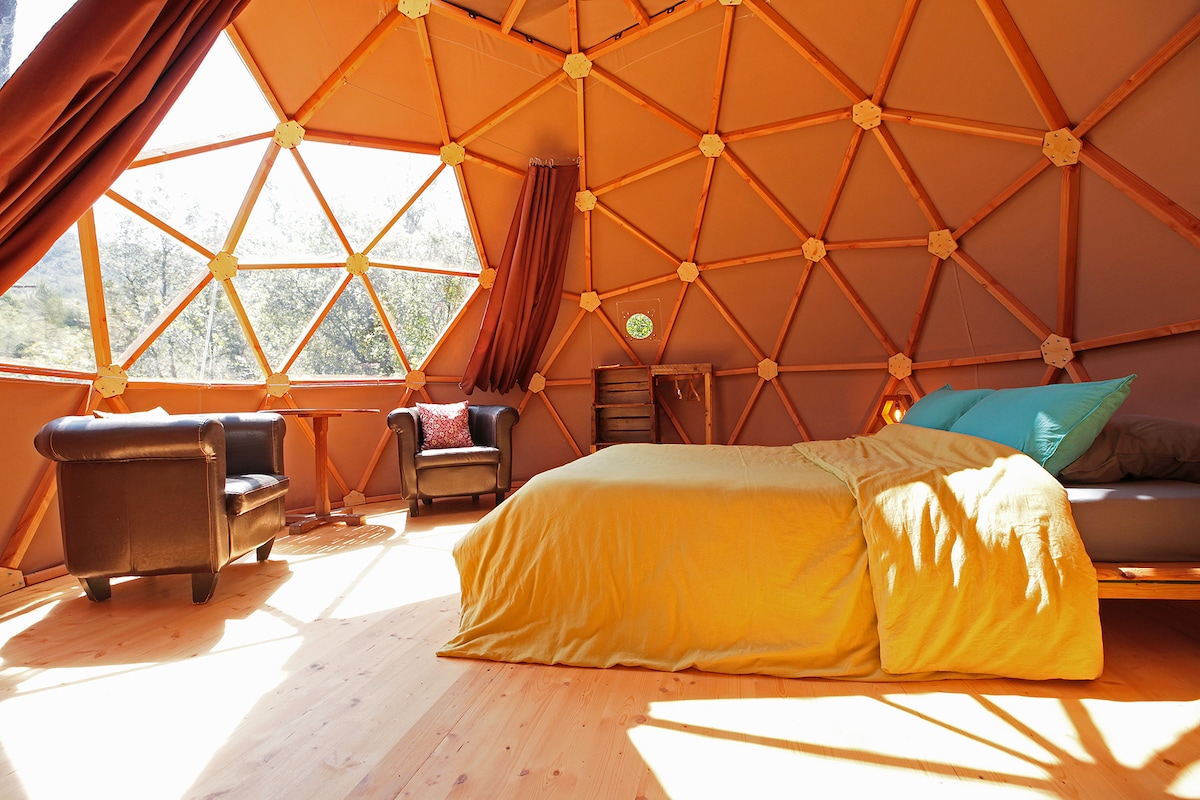 Upplev en unik vistelse i vår geodetiska kupol! Unna er en ovanlig och föryngrande semester genom att bo i vår geodetiska kupol, ett originellt boende mitt i naturen. Denna unika kokong är utformad för att erbjuda dig komfort och total fördjupning i de omgivande landskapen och placerar dig i en miljö som är både modern och naturlig.