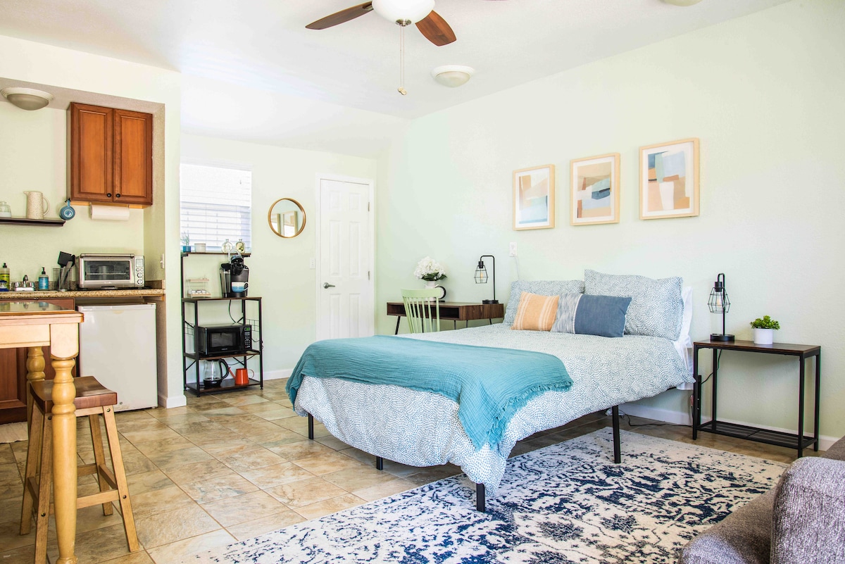 Njut av din vistelse i denna mysiga 1 säng/ 1 badrum studio, som ligger i hjärtat av Gamla stan Clovis. Inkluderar en privat ingång i gränden med inhägnad parkering och nyckellös ingång till boendet. Perfekt för långa eller korta vistelser. Denna enhet har ett pentry, fullt kylskåp, tvättmaskin och torktumlare. Ett bekvämt vardagsrum, sovrum med TV och hyllor för förvaring, sovrummet har en dubbelsäng och vardagsrummet har en full stor utdragbar säng, enheten har också luftkonditionering och wifi.