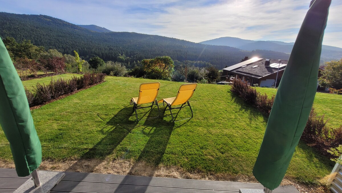 5 Sterne Ferienwohung im Innenhof eines romantischen Bauernhofs im Bayerischen Wald. Die Wohnung ist 84 m2 groß und luxuriös eingerichtet. Das Anwesen liegt in herrlicher Aussichtslage, mitten in intakter Naturlandschaft in Alleinlage. Unter den 2 Ferienwohnungen finden Sie einen Fitnessraum mit Sauna, zwei Spielzimmer mit Tischtennisplatte und Kicker und einen Gemeinschaftsraum mit Heimkinosystem auf 4 Meter Leinwand. Im Garten mit Grillhütte finden Sie auch ein beheiztes Schwimmbad.
