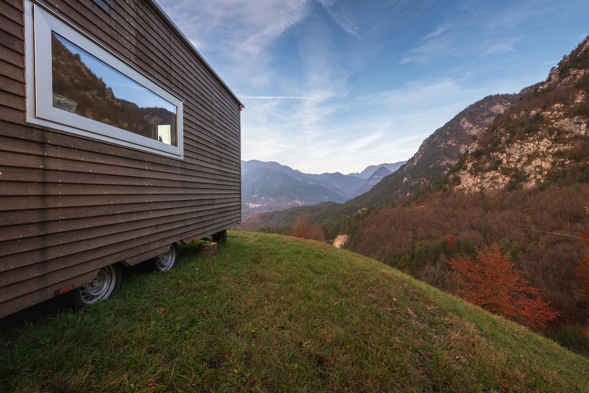 Minihus omgivet av grönskan på minigolfbanan Valbruna. Det lilla huset är det andra på en liten kulle. Inuti hittar du en dubbelsäng, kylskåp, elektrisk kaffekanna, brödrost, mikrovågsugn, vattenkokare och kaffe, snacks, bröd för smörgåsar, sylt. I badrummet finns dusch, handfat och toalett med inbyggd bidé. Tveka inte att kontakta mig om du anländer sent på vintern, så att vi kan gå upp tidigt. uppvärmningen. Från och med den 1 april 2026 kräver kommunen att uthyrningsskatten på 1,50 EUR per person och dag betalas kontant. .