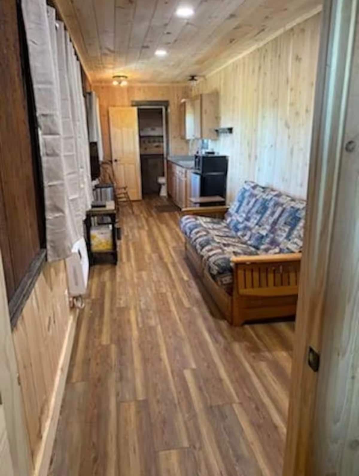 The Semi Cozy... Outdoor Adventure Awaits! This remodeled semi trailer is an efficiently designed tiny house with covered parking, beautiful views and a rustic, one bedroom cabin. The bedroom features a twin single bed plus a bunk bed with spacious double mattresses. All mattresses are new Additional sleeping is on the comfortable futon in the living room. There is an outdoor sink and fire pit. The hot water heater is small so plan on extra time between showers. DVDs and TV also.