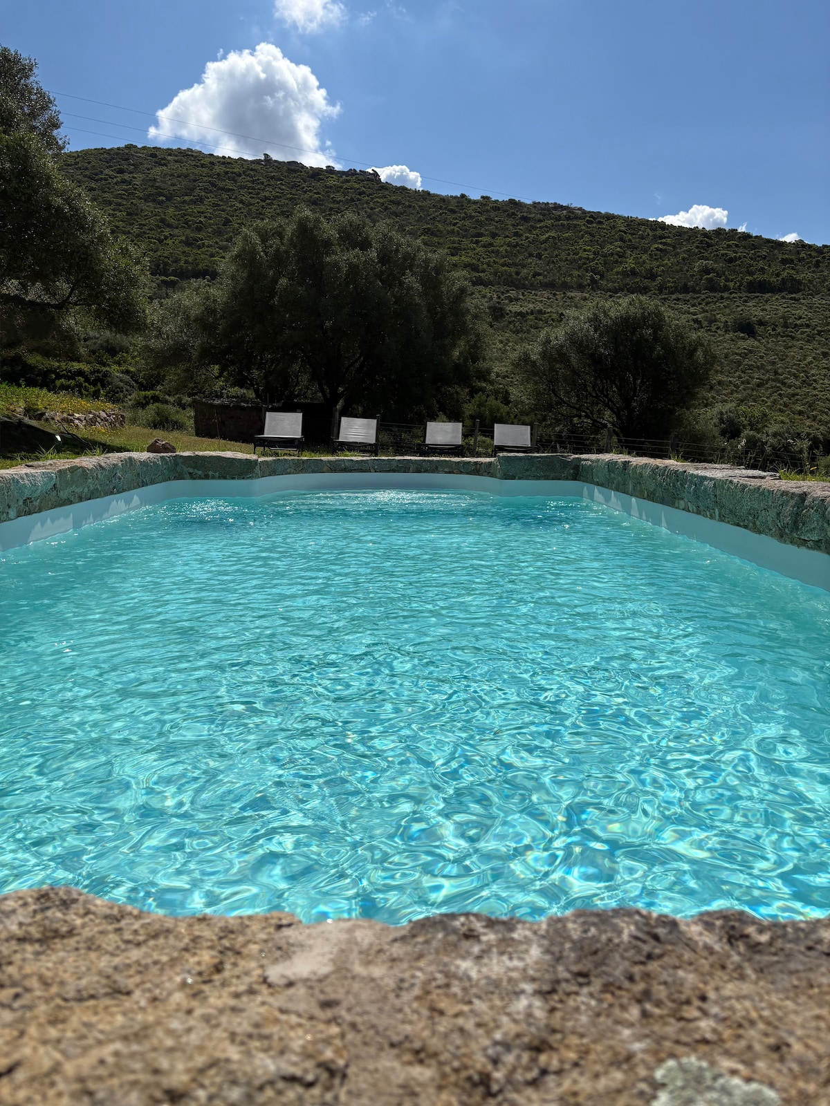Stenhus mellan hav, berg och pool.