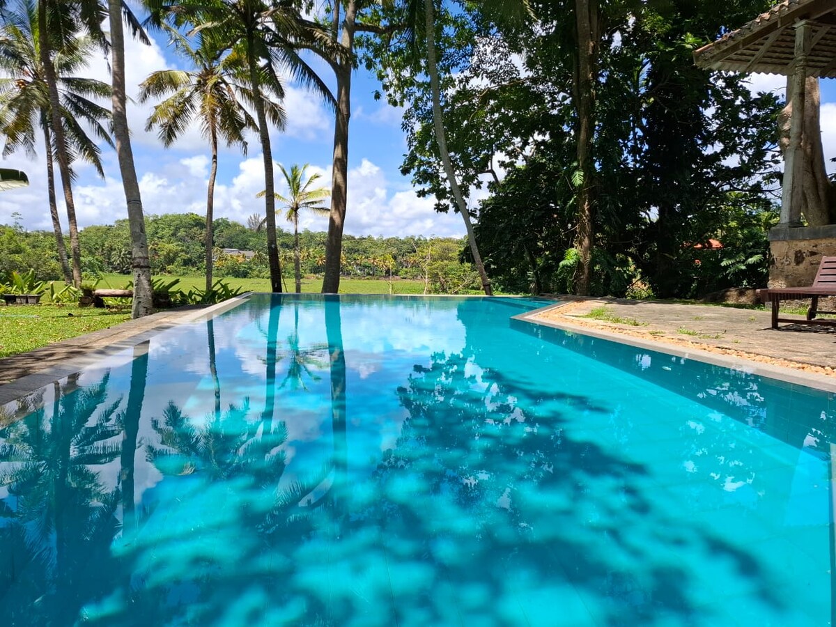 Beautiful secluded eco friendly property set in a verdant lush tropical garden. Wake up to birdsong. Infinity Pool with a fabulous views over rice paddies of Hikkaduwa. The property is rented exclusively & price is based on a couple. Can accommodate up to 7 so please include total no of guests. Villa has 3 bedrooms with ensuites. We have a menu for other meals. The same meal needs to be ordered for group. Need minimum notice of 1 day for food orders.