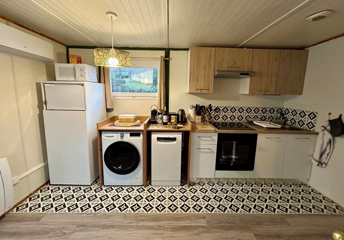 Ovanlig boende i "hobbit"-miljö inbäddad i en vild trädgård med utsikt över staden. Tillträde via en vandringsled (brant). Boendet består av ett vardagsrum med öppen spis, ett litet kök, en alkov för sovrummet, ett litet badrum, en terrass med utsikt över dalen och staden (1 km), och nyhet, ett bad uppvärmt med ved (utom på sommaren) Ljus och musik finns tillgängliga för atmosfären Perfekt för en romantisk vistelse eller en stund utanför tiden!