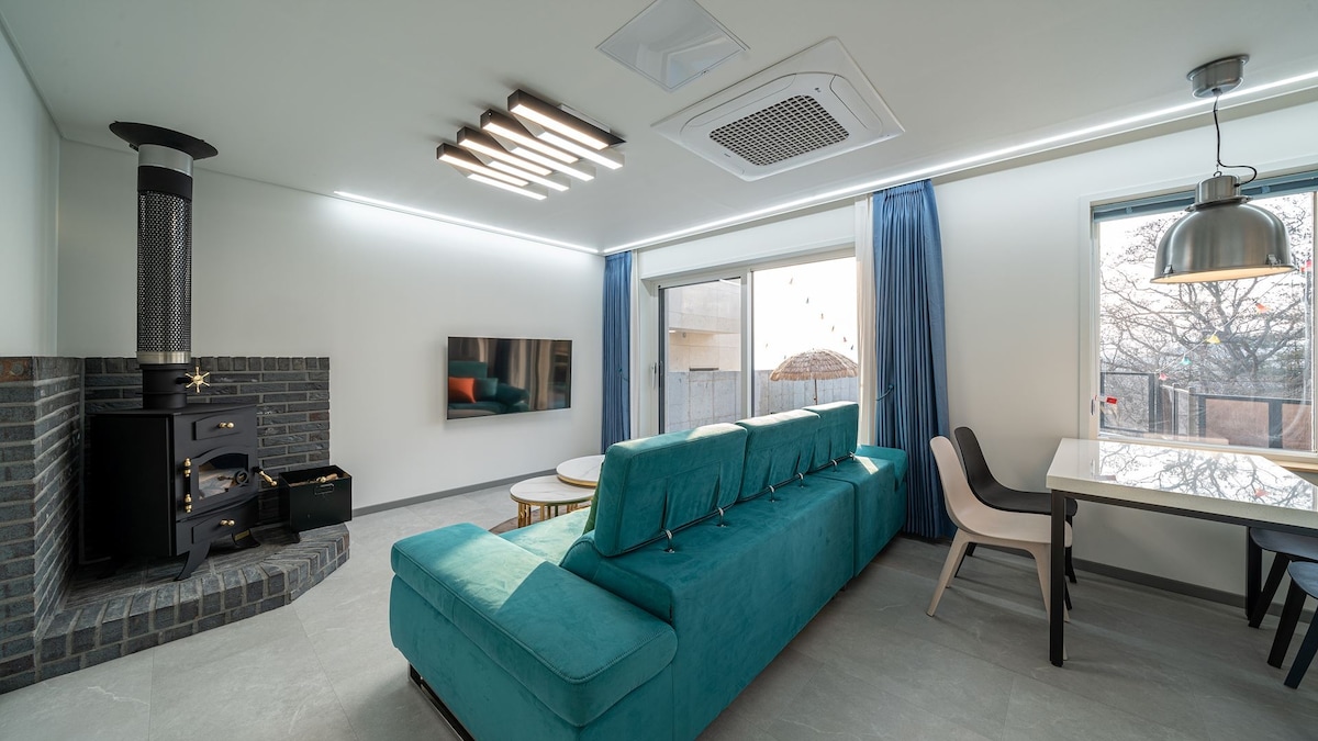 Det är ett privat hus på 300 pyeong beläget i en lugn landsbygdshusby nära Seoul. Den är sydvänt, så morgonsolen lyser väldigt varmt. Vårens körsbärsblom, sommarens dal, höstens färger, vinterns snölandskap, det är det bästa boendet för alla årstider För att erbjuda ett rent och minimalistiskt boende kommer vi att begränsa det maximala antalet gäster till 3 personer för en tid. När du besöker med spädbarn under 2 år är det högst 4 personer. Gäster kan använda hela bottenvåningen och trädgården i ett tvåvåningshus oberoende av varandra. Ägarens hus ligger på andra våningen och ingången är separat så att du kan ha en privat tid. Det är ett grannskap med lugna hus, så det är ett bra boende för dem som vill njuta av en lugn vila. [Grill] Stående grill + grillgaller finns tillgängliga och tilläggskostnaden är 15 000 won. [Eldstad] * Eldstaden börjar användas från den säsong då temperaturen sjunker under noll. * Öppen spis kan orsaka brandrisk och rök kan spridas inomhus, så ägaren tänder den själv~