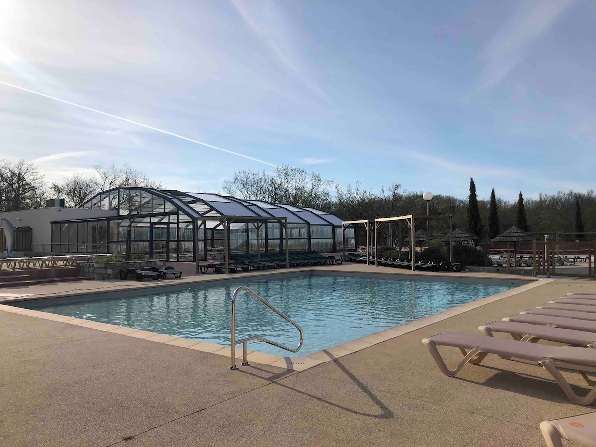 40 m2 LUFTKONDITIONERAT 🏡 HUSVAGN - 6/8 personer nära ROLIG ZON - Dammutsikt - Terrass 20 m2 helt täckt - Trädgårdsmöbler - Solstolar - Plancha - Privat tomt 100 m2🏡 Uppvärmt ⛱ vattenkomplex kantat med palmer, pool, jacuzzi, stor barnpool, 2 rutschbanor 🛝Petanque-banor, tennisbanor, basketplaner, pickleball, minigolf, linbana, spelrum (biljard, arkadspel...), utomhus viktträningsområde, hälsoområde, lekplatser för barn, rutschbanor ...