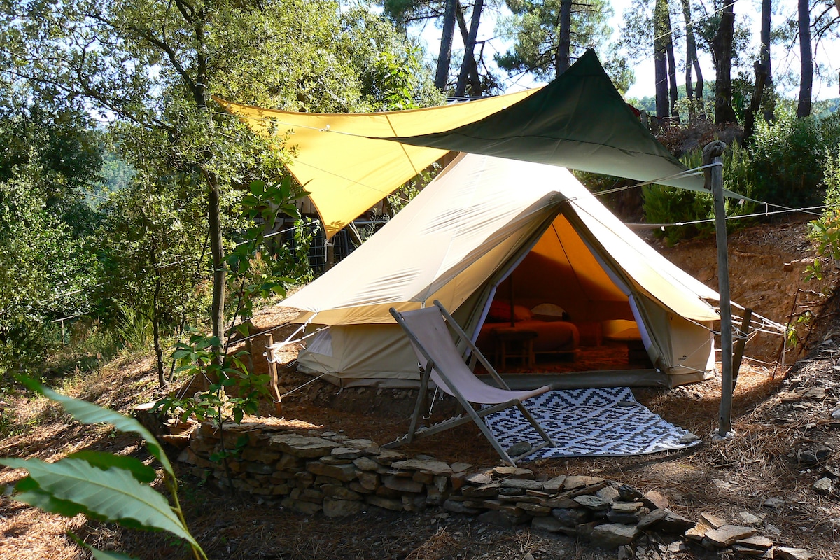 MICA, tält utrustat med alla bekvämligheter 12 m² ren bomull, floden 5 min promenad. En plats utanför tiden. På samma plats LA COLLINE VAGABONDE: 1 annat tält, en stuga på pålar, 1 fristående hus. Tältet, installerat på en kulle mellan tallar och kastanjeträd. Vacker flod 5 minuters promenad. Här lever vi enkelt och i harmoni med naturen, vi älskar också komfort och renlighet. Delat utrustat kök, rinnande och varmt vatten Badrum och torr toalett delas av max 2 par.
