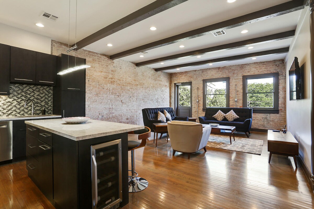 ⭑ Välkommen till The Armstrong ⭑ Denna eleganta svit med två sovrum och två badrum har exponerade tegelstenar, ursprungliga träbjälkar och ett rymligt privat utomhusområde — som blandar New Orleans charm med exklusiv komfort. Armstrong är perfekt för par, vänner eller små grupper och har ett fullt utrustat kök, inomhusmat för sex och ett ljust vardagsrum i hjärtat av Warehouse District. Bara några steg från French Quarter, det är din perfekta bas för att utforska staden.