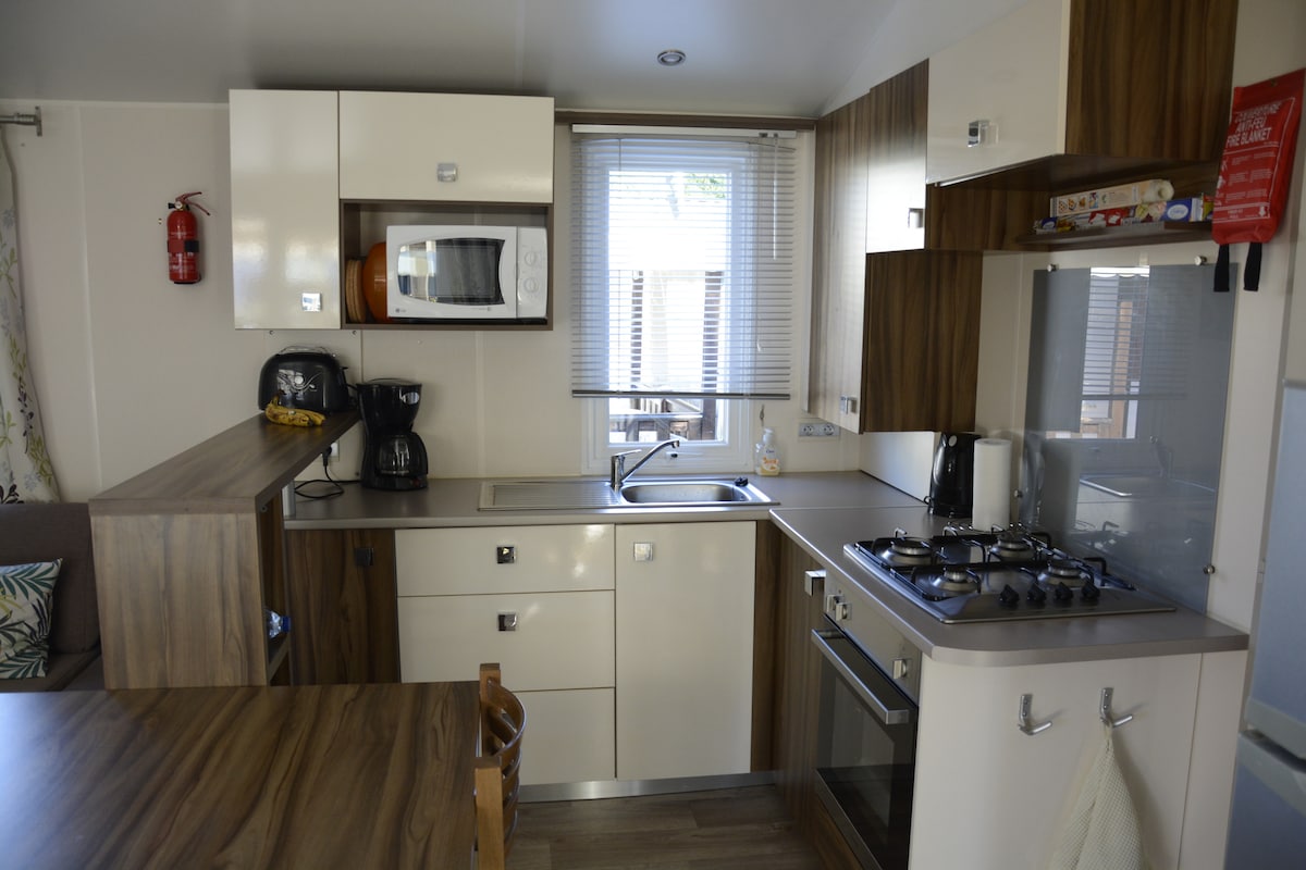 OurMobil Home ligger på vår privata mark på 2000 m2 med ekar i ett lugnt, inhägnad, nära stränderna i Mimizan(12 km), sjön Ste Eulalie (4 km) och cykelvägar,butiker i närheten.Det är idealiskt för familj eller vänner.Den består av ett sovrum med en dubbelsäng, ett annat sovrum med en våningssäng.Dusch rum med dusch, handfat och toalett.Ett vardagsrum/matsal och TV via internet.Ett fullt utrustat kök.Utomhus med allt du behöver,bord, grill....