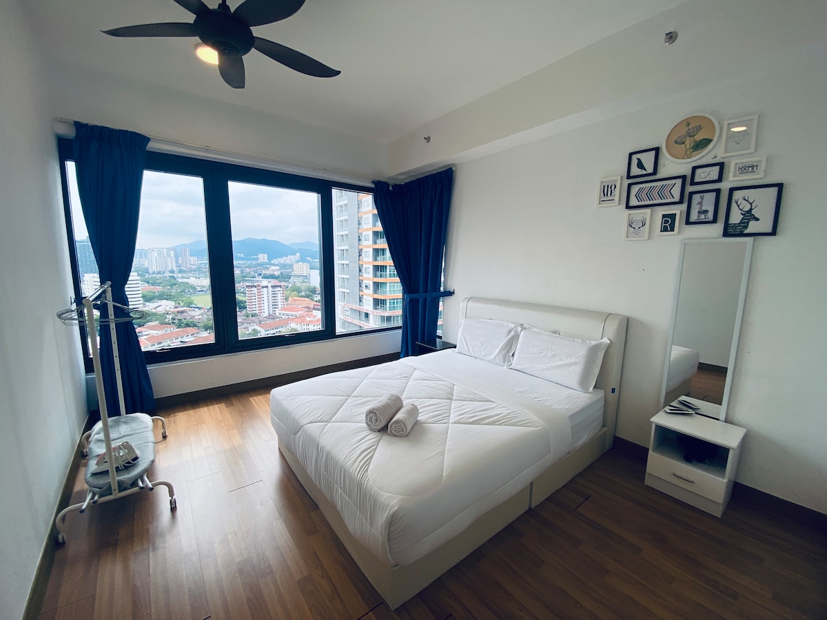 Gratis WiFi, utrustad med smart lås, varmvattenberedare, luftkonditionering, mikrovågsugn och vattenfilter som kan dricka varmt och kallt vatten omedelbart. Gratis 2 parkeringsplatser också. Mycket nära Karpal Singh, 5 minuter till Georgetown med fantastisk havsutsikt och stadsutsikt. Du kommer att kunna se Penang-bron, havsutsikt, Komtar från denna enhet. Beläget på 36: e våningen också. Om du behöver något kan du chatta med mig, för jag stannar i närheten.