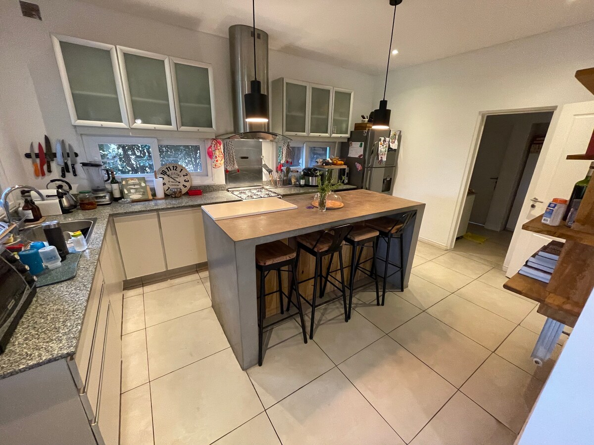 Koppla av och njut med hela familjen i ett varmt hus med alla bekvämligheter med 2 sovrum, en dubbelsäng med en king size-säng och en med en enkelsäng med en utdragbar säng under, för 2 barn, trädgård, grill och pool. Ett superbekvämt och säkert läge 1 kvarter från Marquez och Panamericana, men i lugnet i ett halvslutet område, med allt du behöver för att njuta av sommaren med din familj.