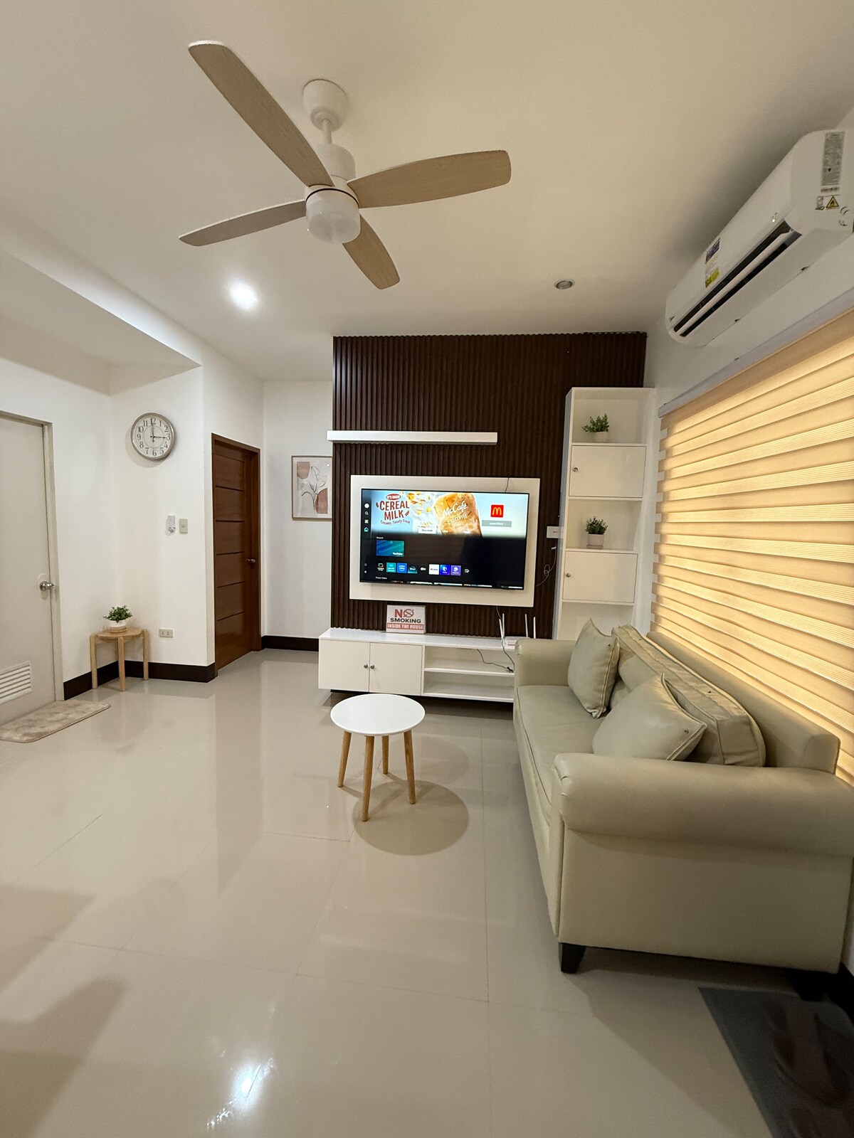 Relax with the whole family at this peaceful 2BR home—cool and quiet even at night. Comfortably fits 4 guests, with a sofa bed for one more guest. All windows have blackout blinds so you can rest anytime. Grill or dine in the spacious patio, host mini gatherings in the extra yard space, or park up to 2 cars securely. Enjoy Netflix-ready TV, board games, and nearby sari-sari stores, laundry, water refilling, and home massage services. Need a ride? We can assist with transport