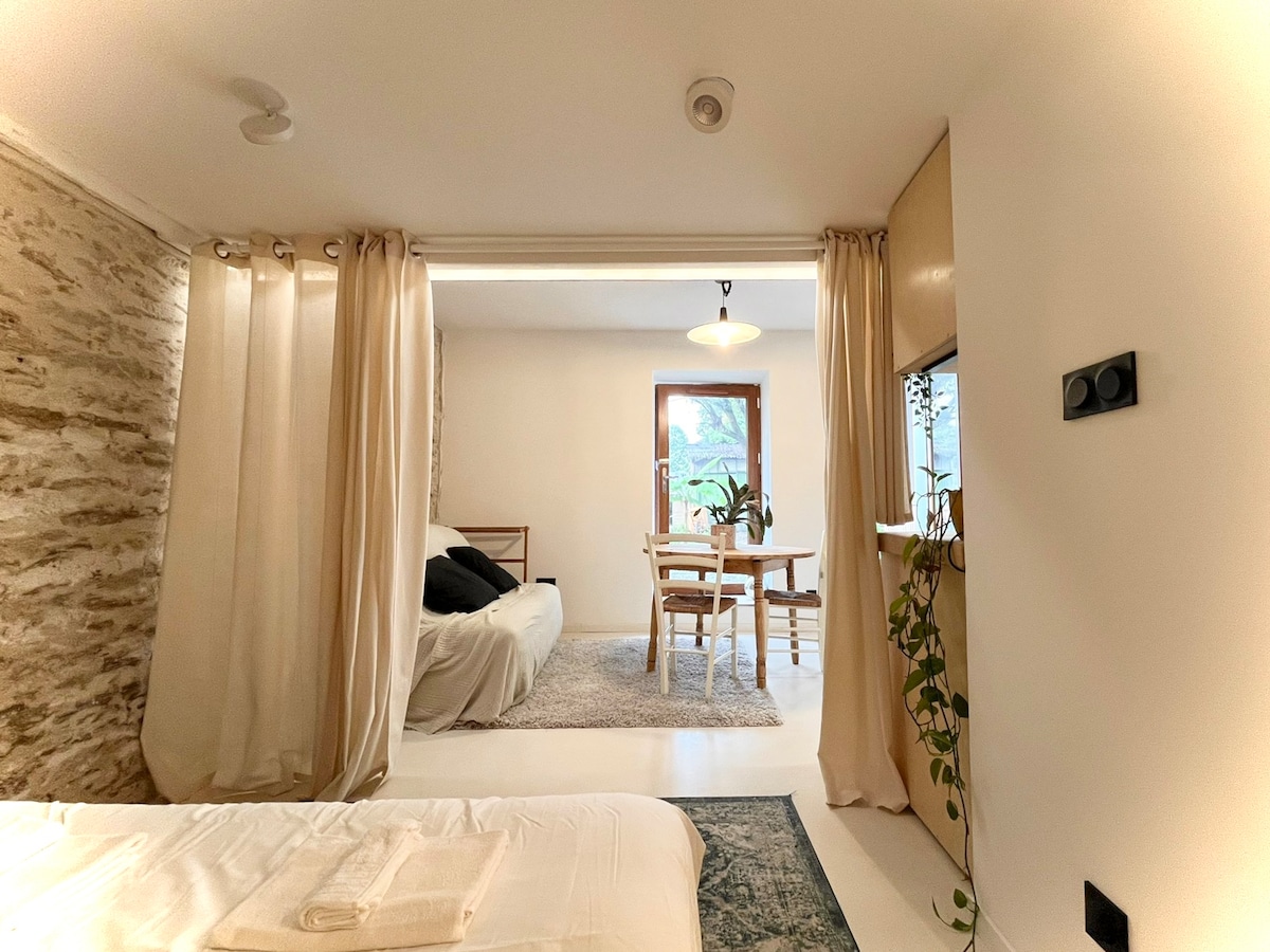 30 m2 studio, vänd mot naturen med terrass och innergård Trädgården och poolen delas med oss. Ett vardagsrum med dubbelsäng, omklädningsrum, TV, möblerat och utrustat kök, 2 bränder, mikrovågsugn, kaffebryggare, vattenkokare och kylskåp. Ett badrum med dusch och toalett. TILLVAL Spa för 5 personer, inklusive 2 solstolar och 3 sittplatser med massage och jacuzzi 40 euro/dag Frukost och måltider på begäran 10 till 20 EUR Husdjursvakt eller utflykt under din frånvaro vid behov 15 till 20 euro