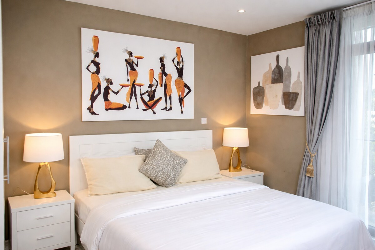 Vår vackra duplexlägenhet kommer att få dig att känna dig som hemma och ge dig en smak av Accra stadsliv. Den ligger i hjärtat av Accra i en prestigefylld ny utveckling i surrande Cantonment bredvid den amerikanska ambassaden. Personligt dörrlås - Gratis WiFi - 15 minuter till flygplatsen - Exklusiv tillgång till 3 pooler - 24 timmars säkerhet och övervakningskameror - Personlig säkerhetsåtkomst med fingeravtryck - Gratis parkering - Minibar med drycker @avgift - Privat balkong med utsikt över Accra City - Queen size-säng med eget badrum