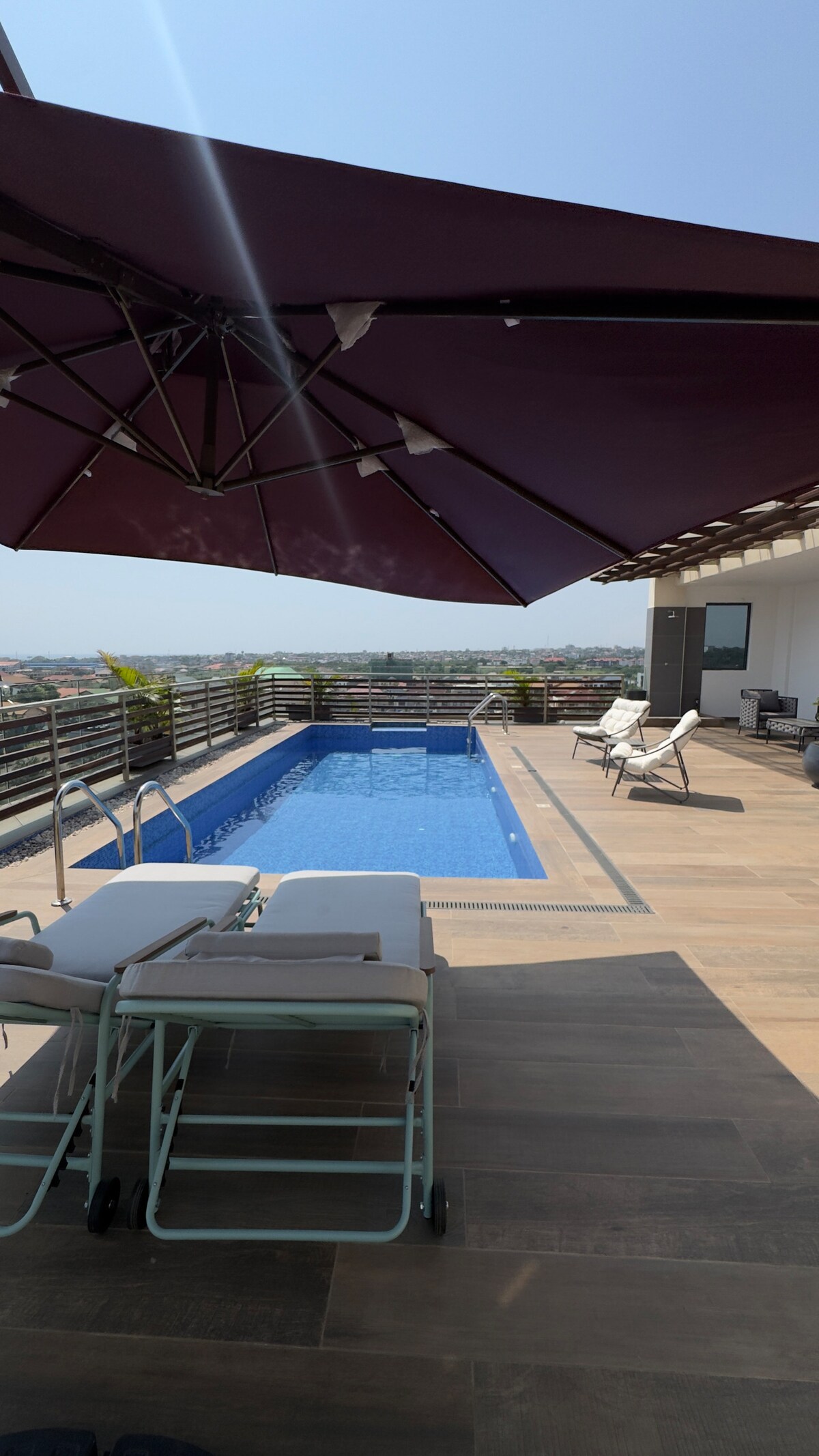 Experience the comfort of this luxurious one-bedroom suite, offering exceptional value just a 10-minute drive from the airport, Osu, Accra Mall, and Cantonments. Enjoy nearby restaurants and shopping within walking distance. Suite features a rooftop terrace with airport views, an outdoor dining area on the ground and rooftop levels, a swimming pool, reliable Wi-Fi, 24h power supply and security. Centrally located in East Airport, at the heart of Accra, it’s thoughtfully designed for your comfort