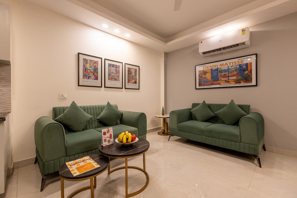 Premium 1BHK Service Apartment i Sector 43, Gurgaon med luftkonditionering i vardagsrum och sovrum, plus en kokvrå med induktion, mikrovågsugn och bestick. I ett elegant område, gångavstånd till Gold Souk Mall & Shalom Hills School, 2,2 km från Millennium City Centre Metro & 2,1 km från Fortis Hospital. Utländska gäster är välkomna. Tidig incheckning kommer att bli föremål för tillgänglighet och debiteras 500 rupier samt sen utcheckning kommer också att bli detsamma med 500 rupier tillagda för varje 3 timmar därefter.