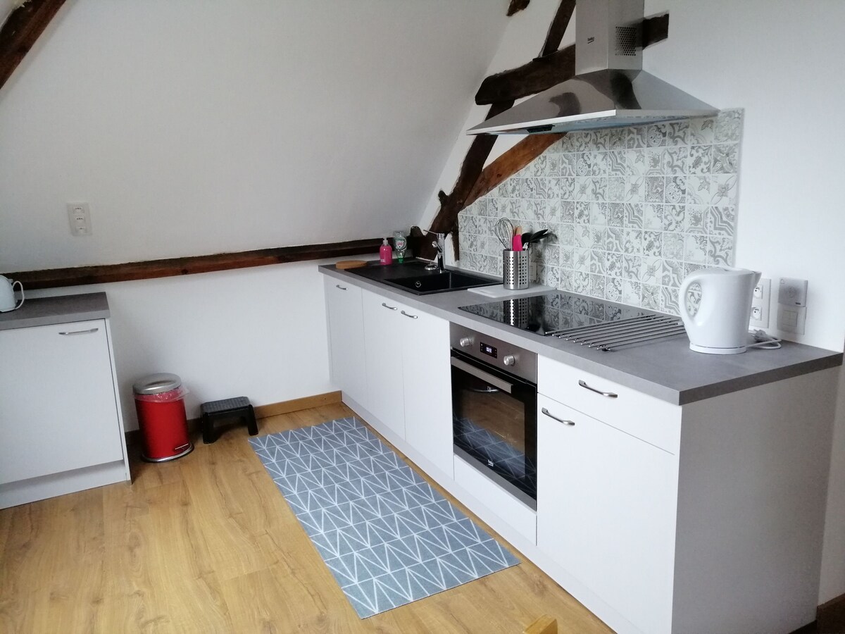 stor studio på 45 m2 på övervåningen, oberoende av ägarens bostad, bestående av ett stort vardagsrum med kök, ett sovrum och ett badrum med dusch. utomhustrappa och täckt terrass pelletseld för två personer med möjlighet till extra sovplats i bäddsoffan privat parkering på fastigheten och möjlighet att säkra cyklar på landet, i en stor trädgård, i centrum av byn mataffär 200 m