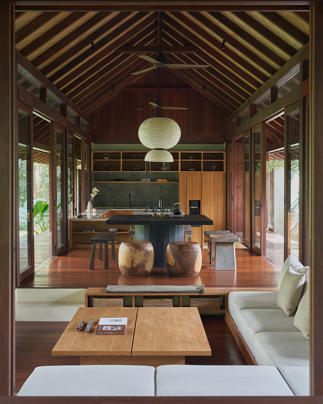 Rumah Haruku blandar sömlöst modern design med naturliga element, vilket skapar en inbjudande atmosfär som harmoniserar med omgivningen. Vardagsrummet i öppen planlösning har expansiva fönster, vilket möjliggör rikligt med naturligt ljus och fri utsikt över det grönskande landskapet. Genomtänkt utvalda interiörer visar upp lokalt hantverk och material, vilket förbättrar den autentiska indonesiska atmosfären. Visas i: Est Living Magazine Design Anthology Magazine