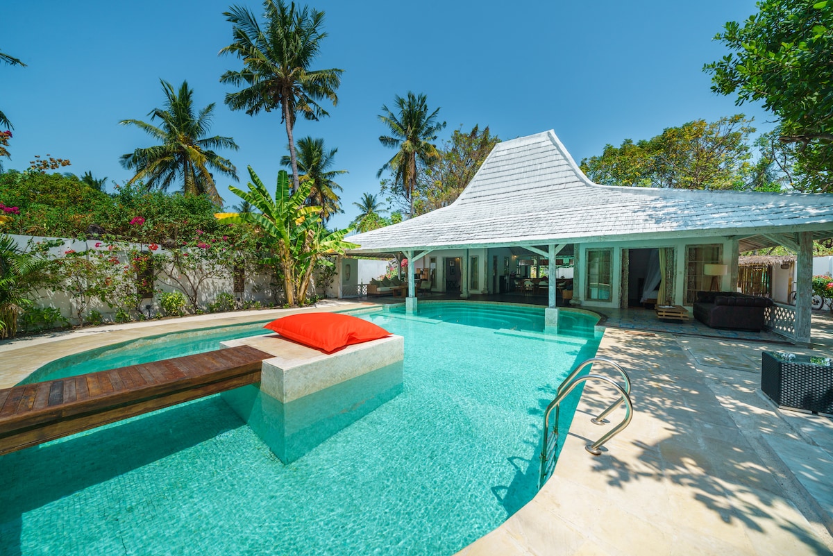 Kura Kura Villa är en rymlig tillflyktsort med 2 sovrum i det tropiska paradiset Gili Trawangan. Perfekt för familjer, par eller små grupper, blandar det modern Wabi Sabi-design med traditionellt javanesiskt träarbete. Det öppna vardagsrummet med en frodig trädgård, privat pool, fullt utrustat kök och bekvämligheter som kaffebryggare, hemmabio och utomhusdusch har allt du behöver för din drömsemester. Du är nära till allt, men kan koppla av i total avskildhet.