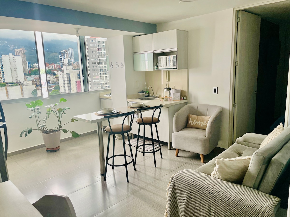 Spektakulär lägenhet på en hög våning med utmärkt utsikt över staden, fullt möblerad med allt för att ge våra gäster all komfort, idealiskt och säkert läge för att röra sig i Bucaramanga och storstadsområdet. Vi har en dubbelsäng och en bäddsoffa. Byggnaden har en portvakt och övervakning dygnet runt. -ENGELSKA TALAS HÄR-