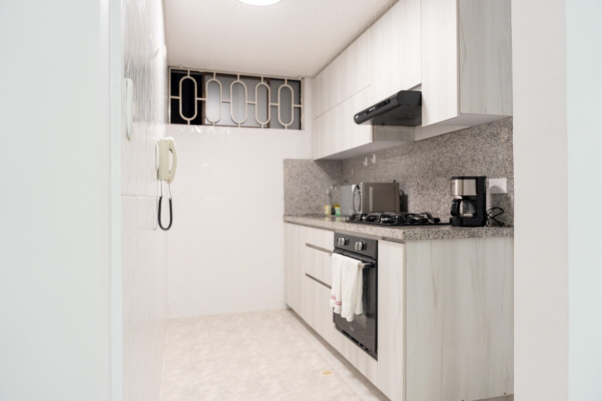 Njut av en bekväm vistelse i ett utmärkt område i Bucaramanga, nära stadens centrum, i vår lägenhet i El Prado-området, perfekt för avkoppling eller arbete. Lägenheten har två bekväma sovrum, en värmare, luftkonditionering, höghastighets-Wi-Fi (idealisk för ett hemmakontor), TV, ett fullt utrustat kök och en (1) parkeringsplats. Byggnaden har ett gym, jacuzzi, turkiskt bad, terrass, 24-timmars säkerhet.