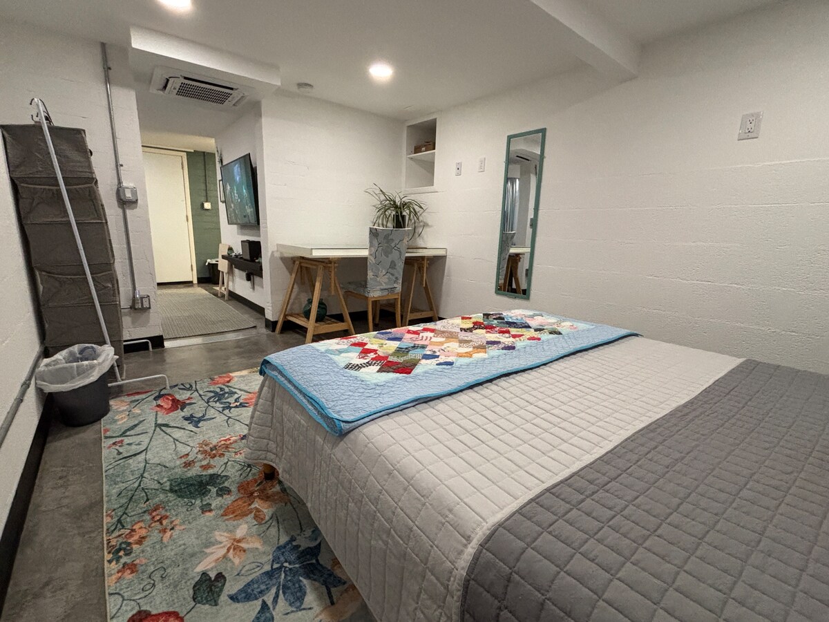 Denna moderna studio har en egen ingång, fullt utrustat kök med alla matlagningsgrunderna och ett fullt utrustat kylskåp och mikrovågsugn samt ett 3/4 badrum med dusch (INGET badkar). Det finns en full storlek futon samt en dubbel storlek luftmadrass vid behov. Denna vackra studio har en fantastisk utsikt från toppen av kullen och ligger inom gångavstånd till historiska centrum, restauranger, shopping och massor mer! * Husägaren bor på plats i huset ovanför studion * *hund måste vara mindre än 30 lbs