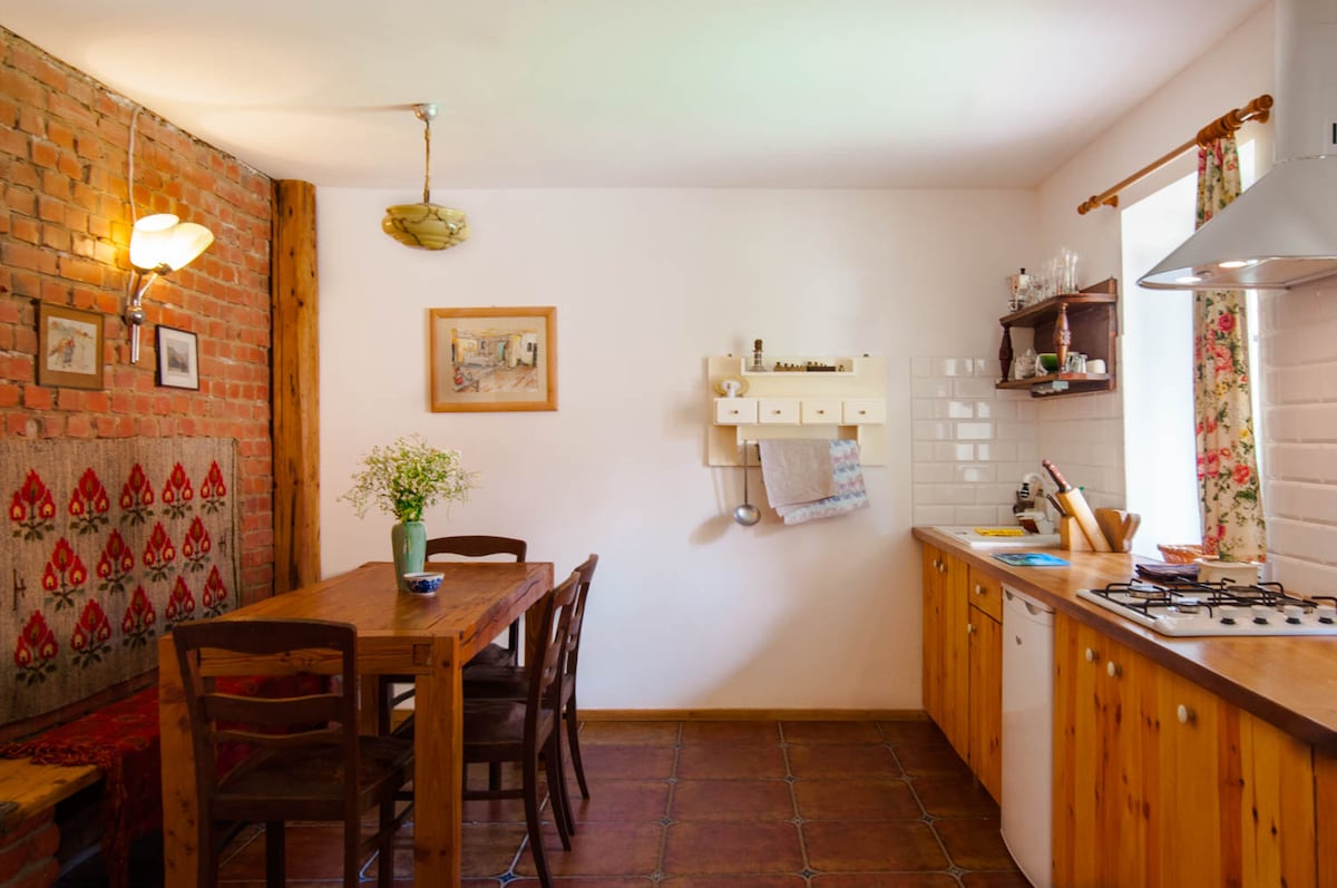 Vårt trähus har designats på ett modernt och funktionellt sätt. Vi försökte smälta in perfekt i miljön och inte störa naturen som omger oss här från alla håll. Vår lilla by har inte gett upp för tiden, allt fungerar här som tidigare. Det finns ingen butik eller restaurang, inga turister, bara tystnad och natur. Byn är omgiven av ängar och Piska urskogen, 10 km till närmaste byar. Tranor och otaliga vattenfåglar bjuder in till en daglig show. Här hittar du lugn