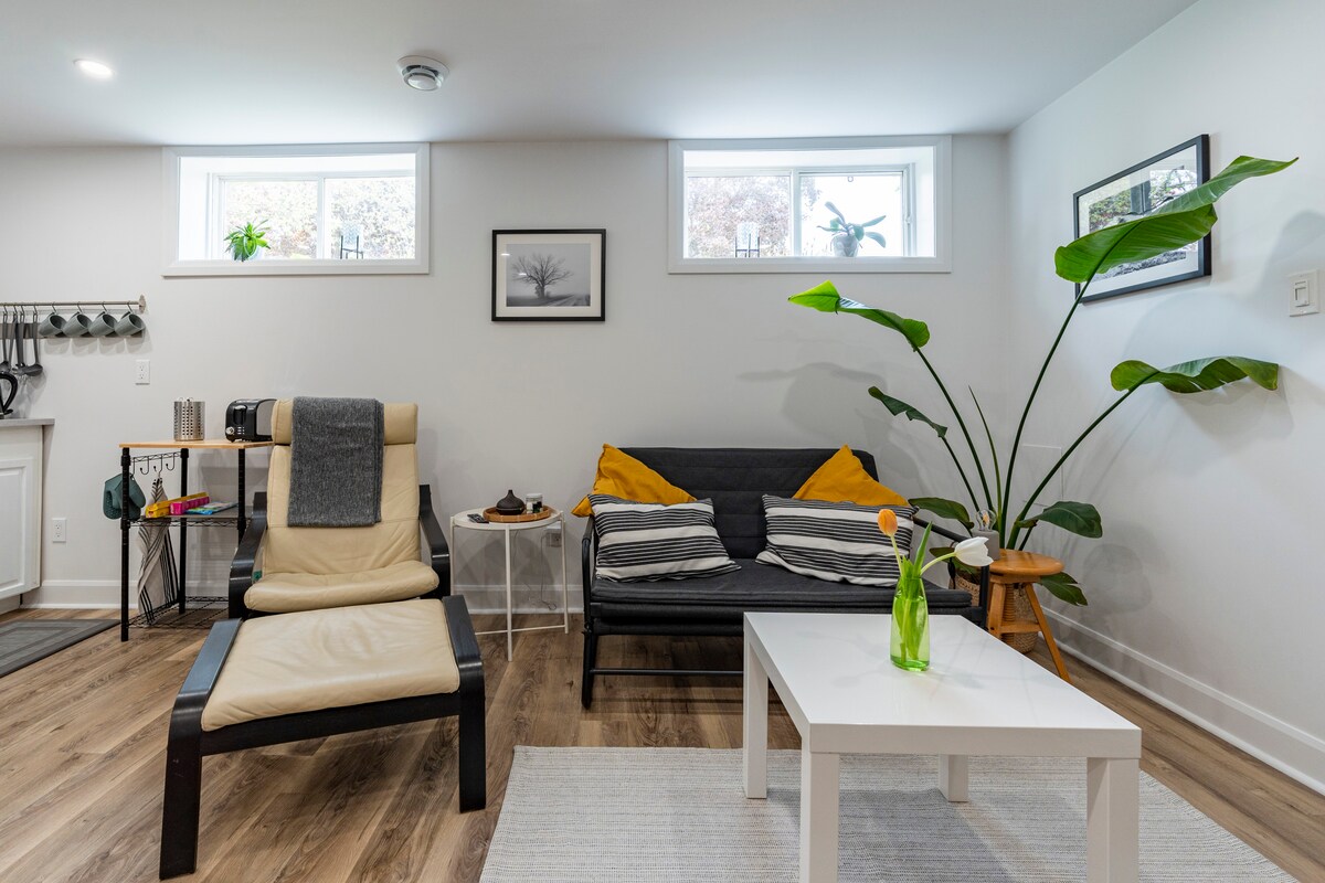 Vi har nyligen renoverat vår källare för att skapa en elegant, modern, mysig och lugn gästsvit. Det finns en sidoingång som öppnas direkt till trappan som tar dig ner till enheten. Den har en låsbar ytterdörr i metall för ljudisolering och säkerhet. Enheten är en ljus studiolägenhet med tre stora fönster, ett fullt utrustat kök, sittgrupp med TV och öppen spis, matbord, dubbelsäng, walk-in garderob och eget badrum med en fem fots dusch. Med omfattande ljudisolering!