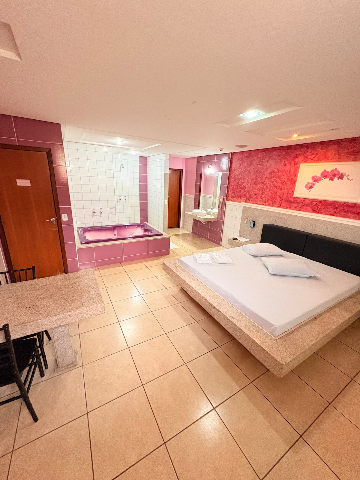 Suíte de MOTEL, com garagem privativa, Dispõe de cozinha com funcionamento 24 horas, com pratos e serviços cobrados separadamente. O espaço foi pensado para proporcionar uma experiência aconchegante, seja para uma noite especial ou uma curta estadia. O quarto conta com cama confortável, ambiente climatizado e decoração moderna, criando um clima agradável e reservado. Tudo é preparado com cuidado para garantir limpeza, conforto e bem-estar