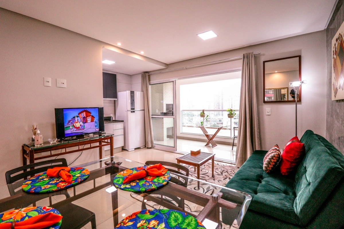 Rymlig miljö, innehållande ett kök utrustat med redskap som gör att du kan laga mat, hög våning med panoramautsikt, komplett lägenhetskomplex: innehållande 24-timmars gym, pool, bastu, restaurang, tvättstuga, stormarknad, skönhetssalong, gratis parkering bland annat. Gästen har enkel tillgång till allt de behöver på denna plats med ett utmärkt läge. Det ligger nära de bästa restaurangerna, barerna, apoteken, sjukhusen/klinikerna och Areião-parken.