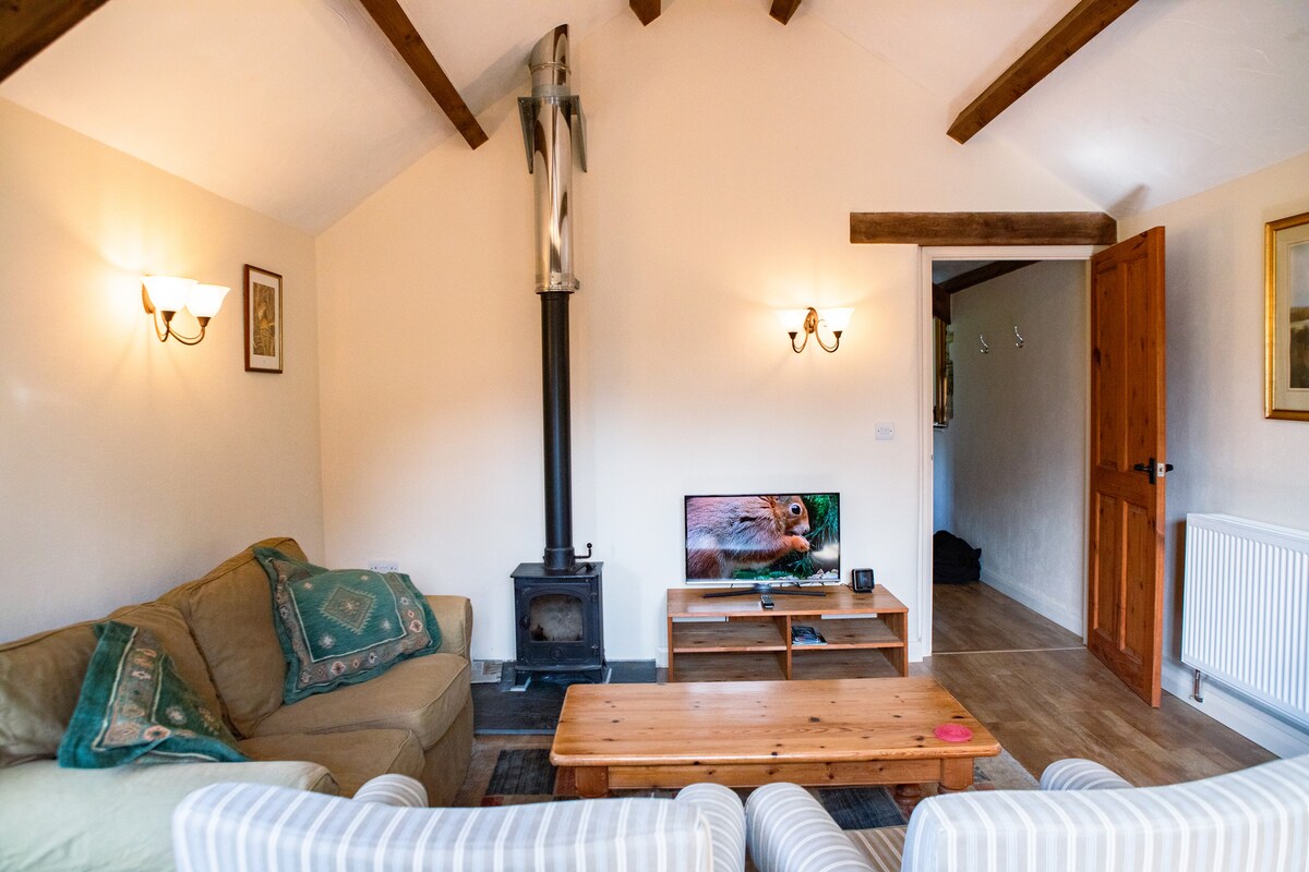 Avlägset belägen, 2-vånings, fristående stuga med stort, öppet vardagsrum med tre aspekter på 1:a våningen med fantastisk utsikt. Nere finns ett sovrum med dubbelsäng, duschrum och kök/matsal med vedeldad spis, matbord och två bekväma stolar med utsikt över omfattande landsbygden. Franska dörrar öppnas mot en terrass med trädgårdsmöbler och chimenea och en privat trädgård med grillplats. Utmärkt Wi-Fi-signal överallt. Väl uppfostrade hundar välkomna -max 2