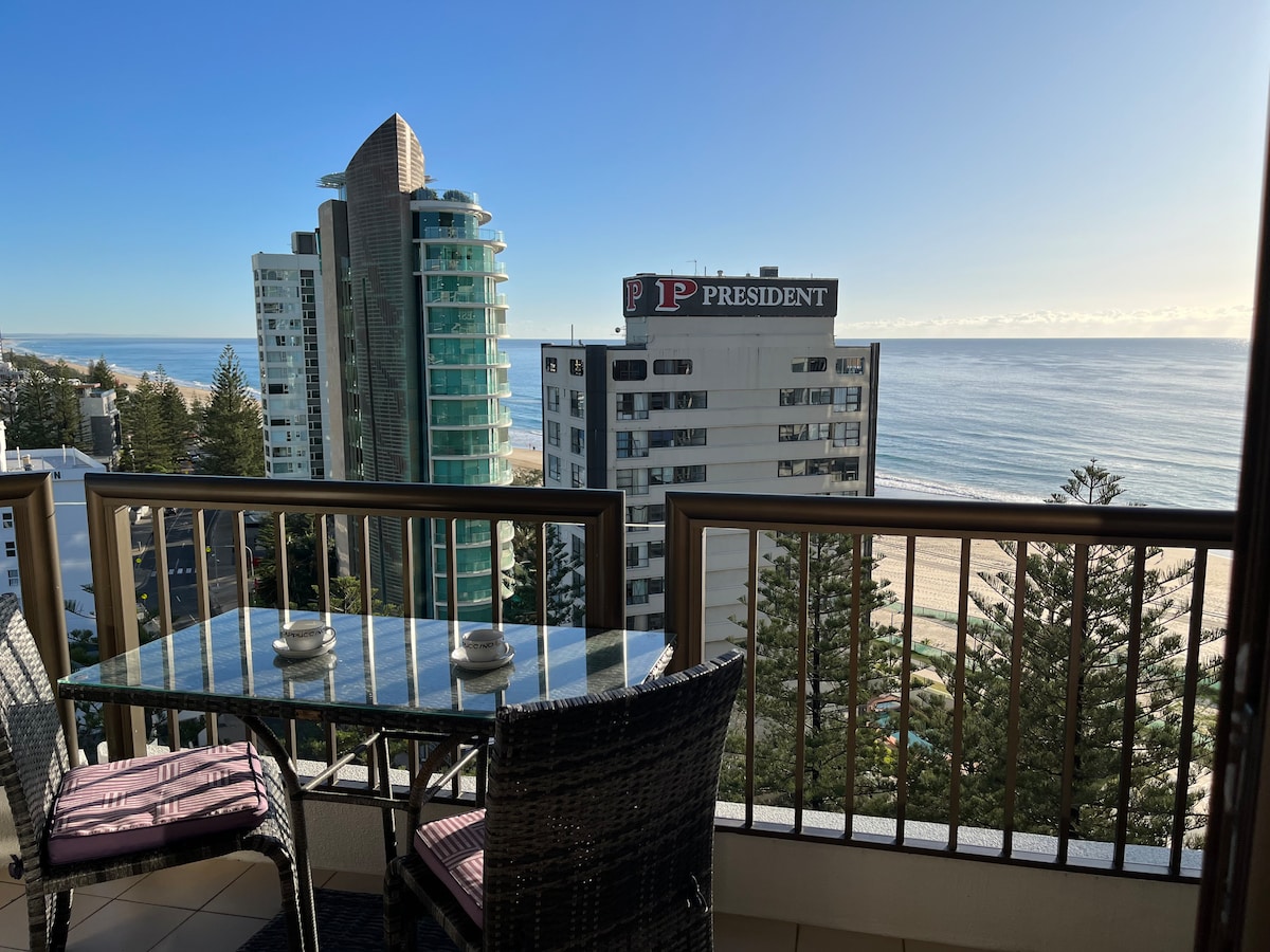 Lägenhet vid stranden belägen på en hög våning med fönster från vägg till tak, privat balkong med havsutsikt och tillgång till stranden till Surfers Paradise-stranden tvärs över vägen. Lägenheten har en dubbelsäng i sovrummet och utfällbar bäddsoffa i loungen. Fullt utrustat kök, höghastighets Wi-Fi, luftkonditionering, TV med Netflix och YouTube, gratis parkering och en komplett privat tvättstuga. Gäster har tillgång till gym, spa, bastu, pool och grill nära poolen och på takterrassen.