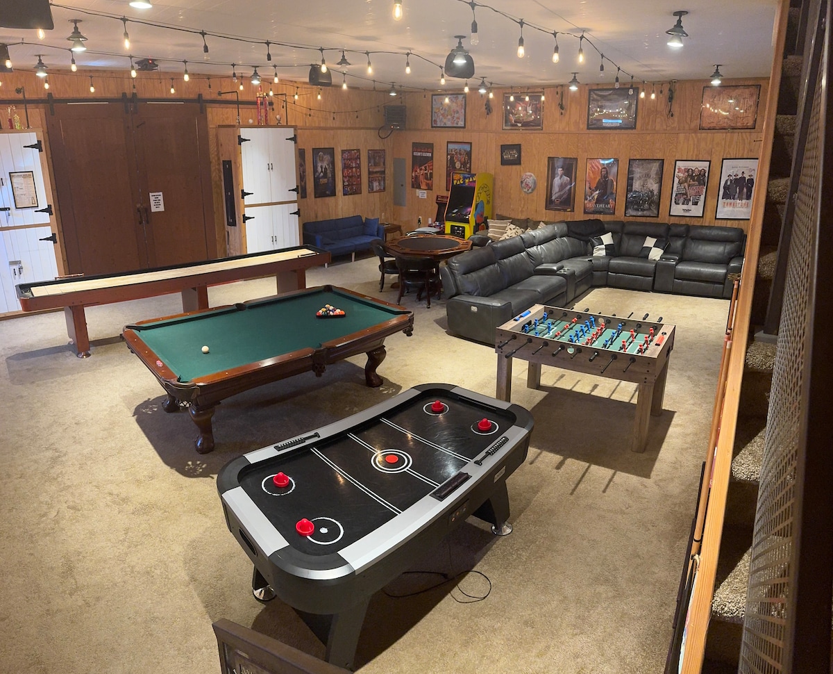 Denna specialbyggda lada har 2 sovrum och 1 badrum. Huvudnivån har ett fullt utrustat spelområde med biljard, shuffleboardbord, airhockey, en 60-game arkadmaskin, en Mortal Kombat-maskin, ett pokerbord och två skåp fullmatade med kort och brädspel. Tre smarta TV-apparater pryder väggarna. Det gemensamma utomhusutrymmet på bakgården inkluderar en bubbelpool, hängmatta, utomhus putting green, en justerbar basketkorg, gungor, en grill, hästskor, en lekplats, ett lusthusområde och en fylld fiskedamm.