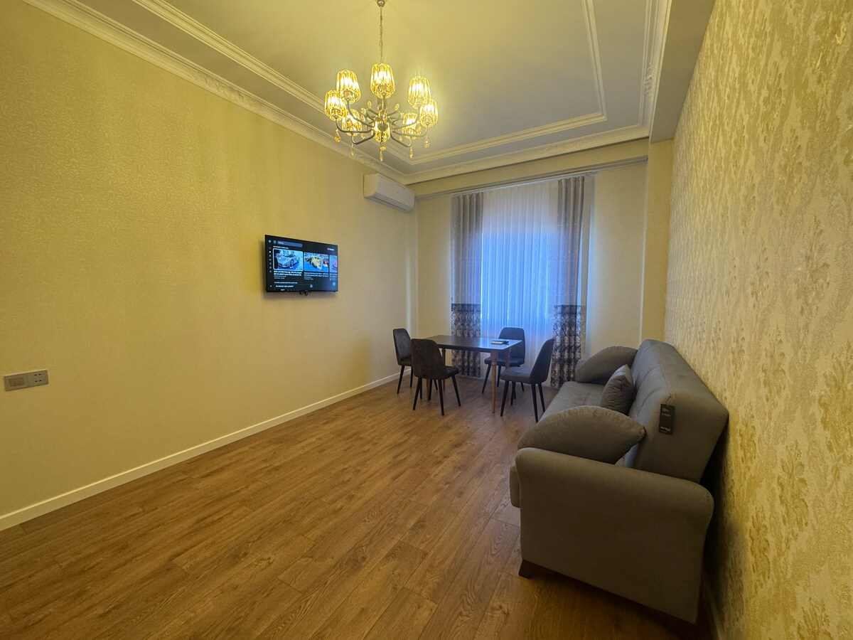 **Skicka ett meddelande till mig för säsongsrabatt** Denna mysiga lägenhet med ett sovrum med fantastisk stadsutsikt över Flame Towers och Kaspiska havet rymmer bekvämt upp till 3 personer. Den har helt nya möbler och modern inredning. Lägenheten ligger precis framför Sharg Bazaar och 15 minuters promenad från ikoniska Heydar Aliyev Centre. Lägenheten ligger 1 min promenad från Yaşıl Bazar (Green Bazaar) där du kan njuta av lokala ekologiska produkter. Denna lägenhet har nyligen renoverats till högsta standard