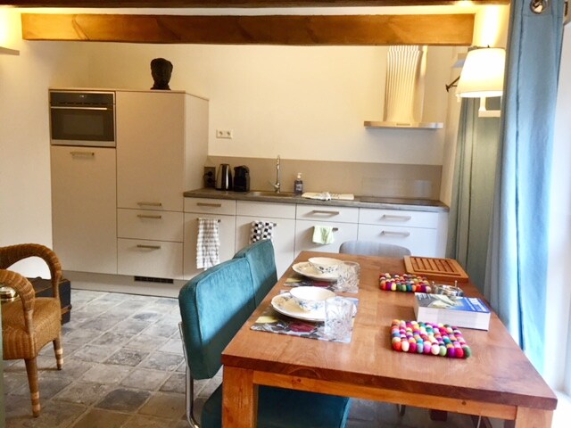 Vårt B&B är utrustat med alla moderna bekvämligheter, såsom ett modernt kök, Philips Hue-belysning, smart-TV och Quooker. Den mysiga verandan är komplett med en lyxig jacuzzi och vedspis. B&B med en stor privat trädgård och fri utsikt är helt avskärmad från gården med ett staket och endast tillgänglig för dig som gäst. Från den finska bastun på den intilliggande terrassen har du utsikt över de pittoreska stadsängarna. En härlig frukost efter önskemål är valfri.
