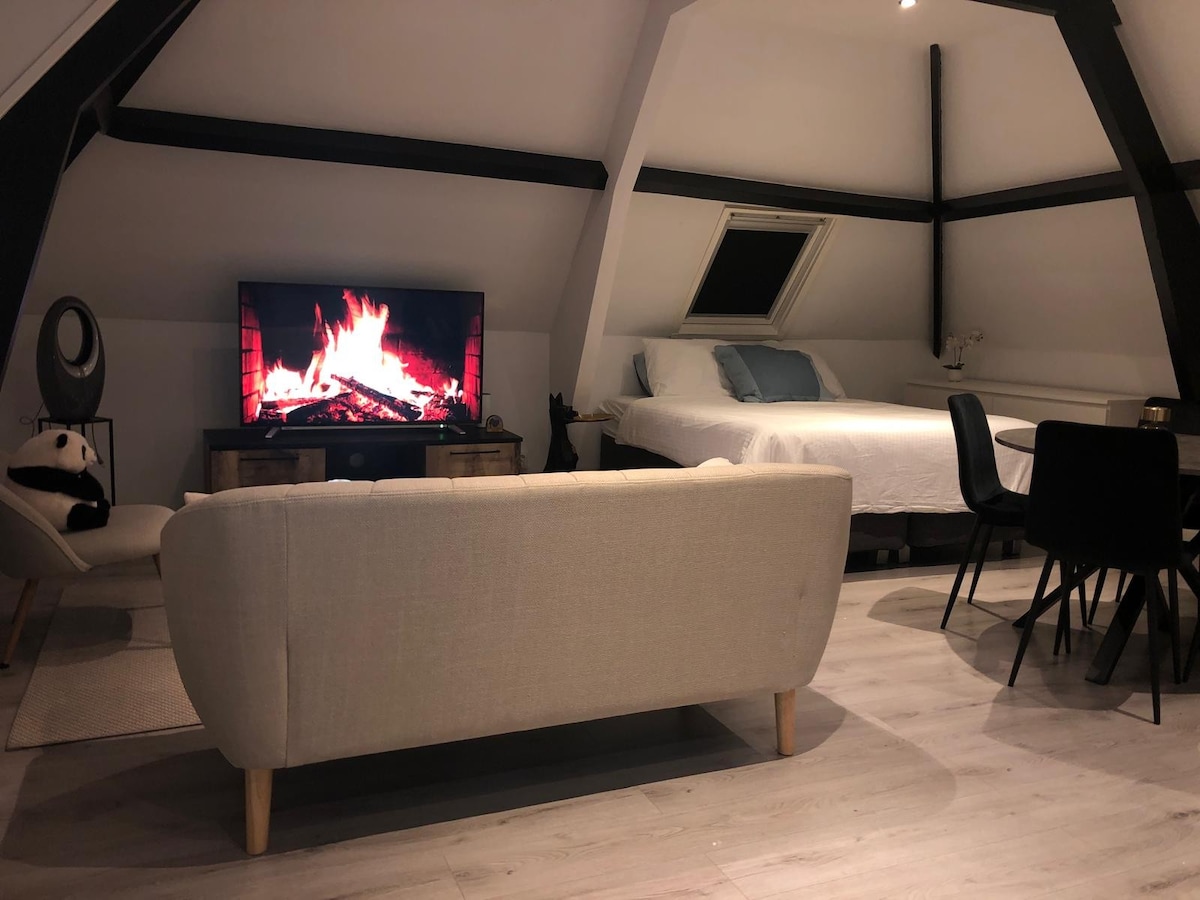 Nyrenoverad lägenhet på andra våningen i monumentala destillatörer radhus. Rymligt loft med kök, badrum, toalett, sittgrupp och bäddsoffor. Centralt beläget i historiska Schiedam, 10 minuter med kollektivtrafik till Rotterdam och Delft, 20 minuter med kollektivtrafik till Haag. Huset är monumental status och bjälkarna är låga 170 cm. Det är också lämpligt för längre vistelser.
