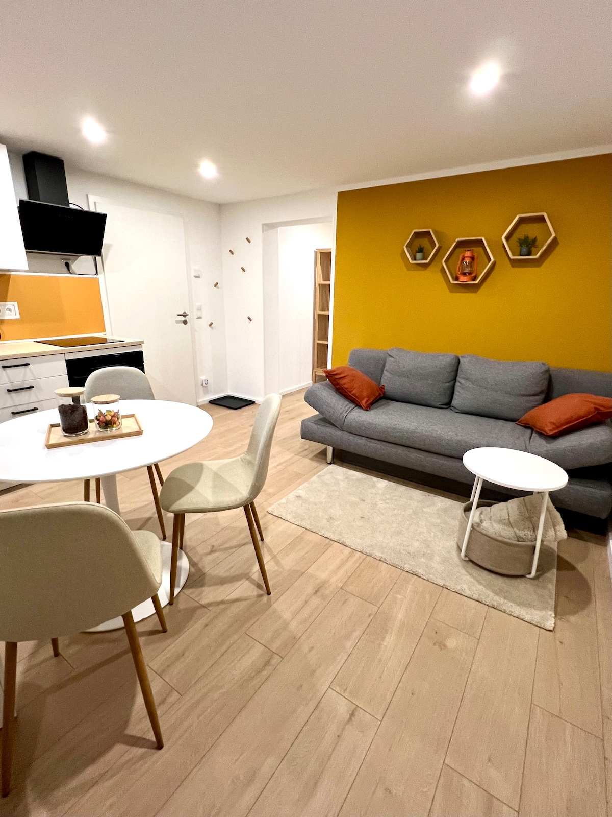 Die Wohnung besteht aus einem Wohnraum mit Küchenzeile, Bad, Schlafzimmer und einem großen Balkon. Hervorzuheben ist die gut ausgestattete Kücheneinheit mit modernen Geräten (u.a. Induktionskochfeld, Umluftherd, Kühlschrank mit Eisfach, Spülmaschine, Waschmaschine). Vorhanden sind auch z. B. Küchewaage, Reibe, Salatschleuder, Knoblauchpresse. Das Sofa lässt sich zu einem bequemen Schlafplatz umwandeln (160x200) Auch ein großer TV-Flachbildschirm ist vorhanden. Es gibt absichtlich KEIN W-LAN