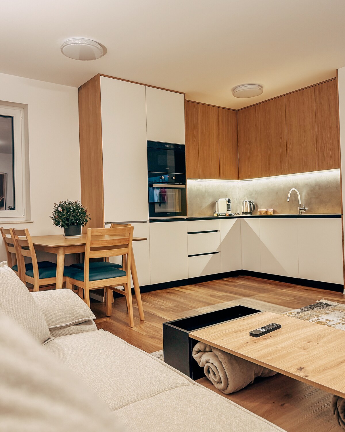 What should the home of people whose main passion is travel look like? The hosts, who travel often, especially appreciate coziness and comfort. For them, travel is not a vacation, but rather new impressions and a change of scenery, an opportunity to get out of their comfort zone and return to it. With the most beautiful view in the center of Prishtina we continued the project's strong combination of colors and design styles is a huge number of kinesthetic elements we instilled everywhere.