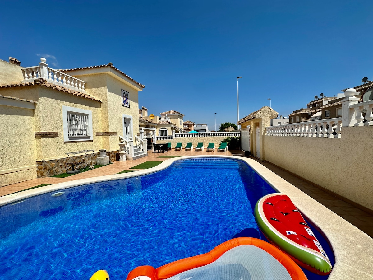 Private Luxury Villa Tropical Garden With Waterfall, large Pool, Full outdoor kitchen with seating area, Bar , BBQ, jacuzzi chill area, Rated best location in Torrevieja close to Beach, Waterparks, Bars & Restaurants, just 5 mins walk to Sea the beautiful ( Salt Lakes ) Your family will be close to everything when you stay at this centrally-located place Nature reserve featuring salt lagoons known for pink lakes. if 13 or more guests we will add more beds to the rooms. will need notice.